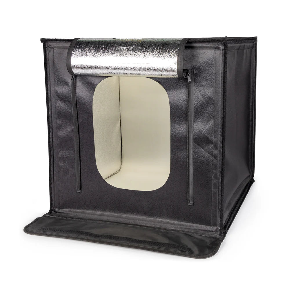 Bring your creativity to life with this portable, foldable studio featuring customizable RGB LED lighting and interchangeable background sweeps. Measuring a generous 23" square, it’s perfect for photographing and filming still lifes, small products, and creative subjects with professional-quality results.