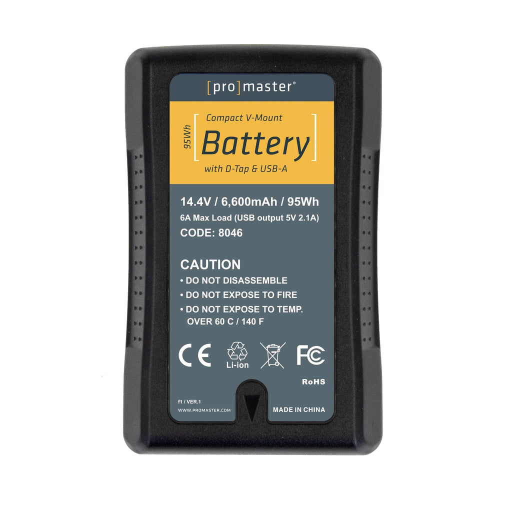 The ProMaster 8046 Compact V-Mount Battery Kit is a small yet high capacity (14.4V / 6,600 mAh / 95 Wh) li-ion battery with D-Tap and USB-A ports. It supports a continuous draw up to 6A at a nominal 14.4 V. This kit includes a D-Tap charger for convenience and value.