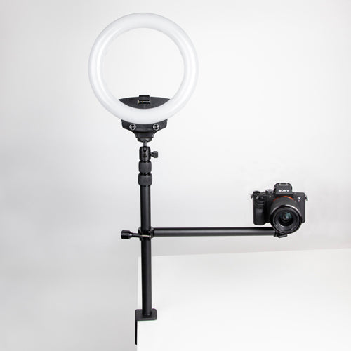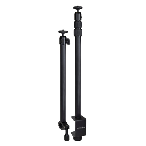 The ProMaster Desktop Broadcast Stand clamps to the edge of a desk, table, or countertop surface up to 2" thick. It supports two accessories while reaching over and around your computer.
