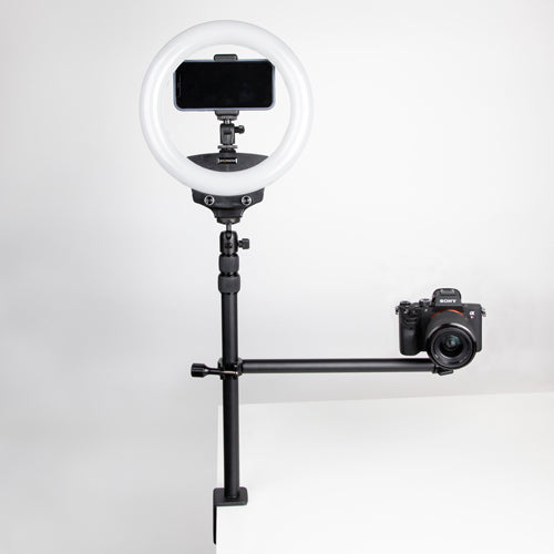Use the Desktop Broadcast Stand to support two objects like a camera and a light, or a light and a mic, or ??? Position them at any angle you like using both ball heads. Raise and lower the main upright using its 3 sections with a range of 17 5/8" (min. height) to 41 3/4" (max. height). Then clamp-on the extension arm anyplace along the upright to hold a second accessory.