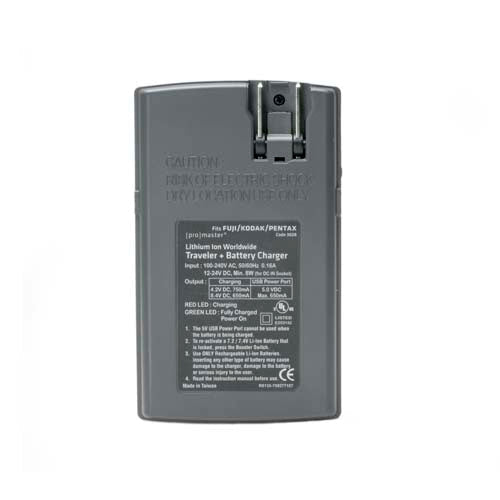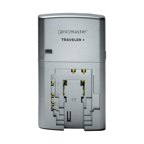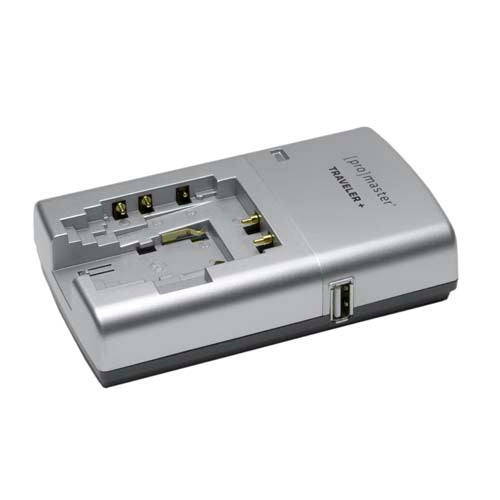 The ProMaster TRAVELER + LITHIUM ION BATTERY CHARGER is a versatile, compact, go anywhere charger for your Li-ION digital camera and camcorder batteries. The Traveler + charger features a built in switching power supply that can be powered from either 110v - 240v AC or 12V DC (optional DC power cord required) for true worldwide compatibility. Combined with the USB power output port and its compact size, it makes a PERFECT solution for those on the go or to use at home. The ProMaster Traveler + charger is available in models to fit most Li-ION digital camera batteries.