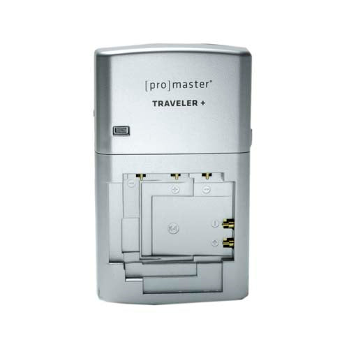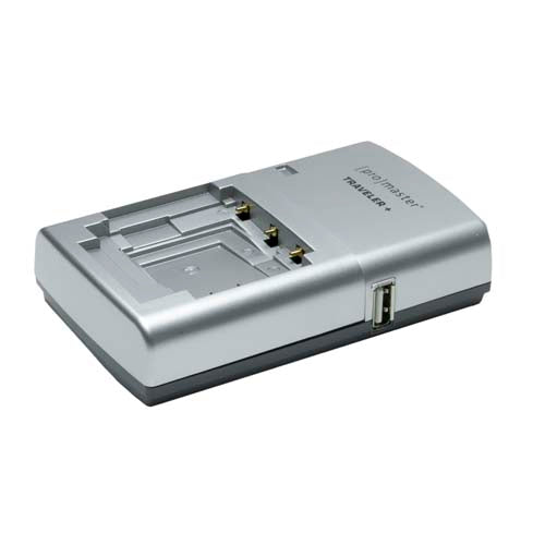 The ProMaster TRAVELER + LITHIUM ION BATTERY CHARGER is a versatile, compact, go anywhere charger for your Li-ION digital camera and camcorder batteries. The Traveler + charger features a built in switching power supply that can be powered from either 110v - 240v AC or 12V DC (optional DC power cord required) for true worldwide compatibility. Combined with the USB power output port and its compact size, it makes a PERFECT solution for those on the go or to use at home. The ProMaster Traveler + charger is available in models to fit most Li-ION digital camera batteries.