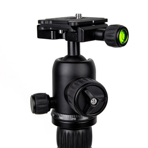 The ProMaster XC-M 528 tripod's 5-section, transverse legs fold 180° making the entire unit just 16 1/2" long for storage and travel. Fully extended, it reaches a working height of over 6.5'! Each leg's angle and length are independently adjustable, allowing the XC-M 528 to properly support your camera on uneven ground. A two-stage center column allows you to maximize working height without sacrificing the tripod's compact size. The center column is reversible, and the weight hook can help achieve better stability in windy conditions or when making long exposures. Its dual-action ball head is strong, precise, and lightweight, with independent pan control. It has an integrated memory lock for repeatable tension control and uses ProMaster's Dovetail quick release system (Arca-compatible) for fast and secure camera connection.