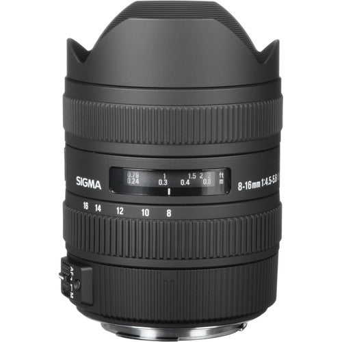 The Sigma 8-16mm F4.5-5.6 DC HSM is an ultra-wide zoom that has a 35mm equivalent angle of view of a 12-24mm lens when used on DSLRs with APS-C size image sensors. Sigma's FLD glass elements, equal to fluorite glass, correct for distortions and color aberrations to deliver beautiful high contrast images.