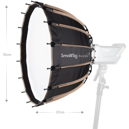 Create a beautiful, even key light for still or video productions with this flexible RA-D55 Parabolic Softbox from SmallRig. Designed to set up and pack away quickly in the included carrying case, the softbox has a 21.6 x 14.6" opening for a strong yet soft and controllable output. Soften the light output with the included internal diffuser, or remove the diffusor to increase the light output. You can mix and match using either or both the internal and external diffusers to soften the light.