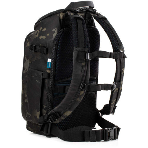 The updated multicam black, 16L Axis V2 Backpack from Tenba is built for the working professional, content creator, photographer, or filmmaker. The pack holds two mirrorless or DSLR cameras, six 2.8mm zoom lenses, an 11" tablet, and a compact drone. This backpack is the first to include a hidden neoprene pocket that holds an Apple AirTag or Tile Bluetooth Tracker. The MOLLE webbing all around the exterior of the pack allows you to add additional Tenba accessories, including lens capsules, battery pouches, and card wallets. Tenba's exclusive Airflow harness and auto-adjusting Pivot-Fit straps mean the pack will fit, no matter what shape or size you are. The bag has unique dual sternum straps to ensure superior load-balancing across the chest, and allowing female users to position the straps above or below the bust for superior comfort. One of the sternum straps can be removed, if desired. A reversible rain cover is included, one side is black and the other silver to reflect UV rays.