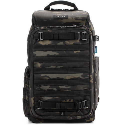 The updated multicam black, 24L Axis V2 Backpack from Tenba is built for the working professional, content creator, photographer, or filmmaker. The pack holds two mirrorless or DSLR cameras, eight 2.8mm lenses, a 16" laptop, and a compact drone. This backpack is the first to include a hidden neoprene pocket that holds an Apple AirTag or Tile Bluetooth Tracker. The MOLLE webbing all around the exterior of the pack allows you to add additional Tenba accessories, including lens capsules, battery pouches, and card wallets. Tenba's exclusive Airflow harness and auto-adjusting Pivot-Fit straps mean the pack will fit, no matter what shape or size you are. The bag has unique dual sternum straps to ensure superior load-balancing across the chest, and allowing female users to position the straps above or below the bust for superior comfort. One of the sternum straps can be removed, if desired. A reversible rain cover is included, one side is black and the other silver to reflect UV rays.