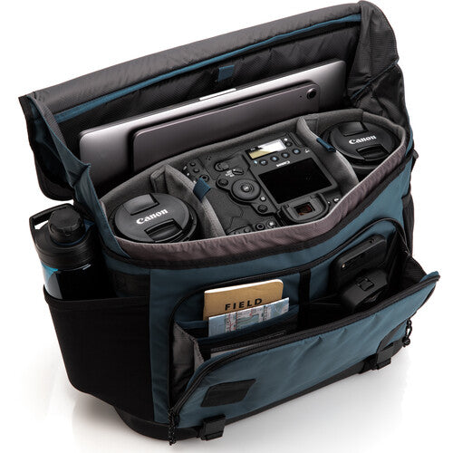 Designed for effortless transitions between photojournalism and sports photography, urban exploration and adventure travel, as well as various social events with or without a camera, the blue Tenba DNA 16 Pro Camera Messenger Bag accommodates a professional-sized DSLR camera with a grip and attached 70-200mm lens, with space for up to six additional lenses, a flash, accessories, personal items, a laptop, and a tablet. The camera and lenses are secured in a padded insert within the main compartment, which can be removed to convert the bag into a conventional one. With thoughtful design features and proprietary hardware, this bag offers ease of use and durability against the elements.