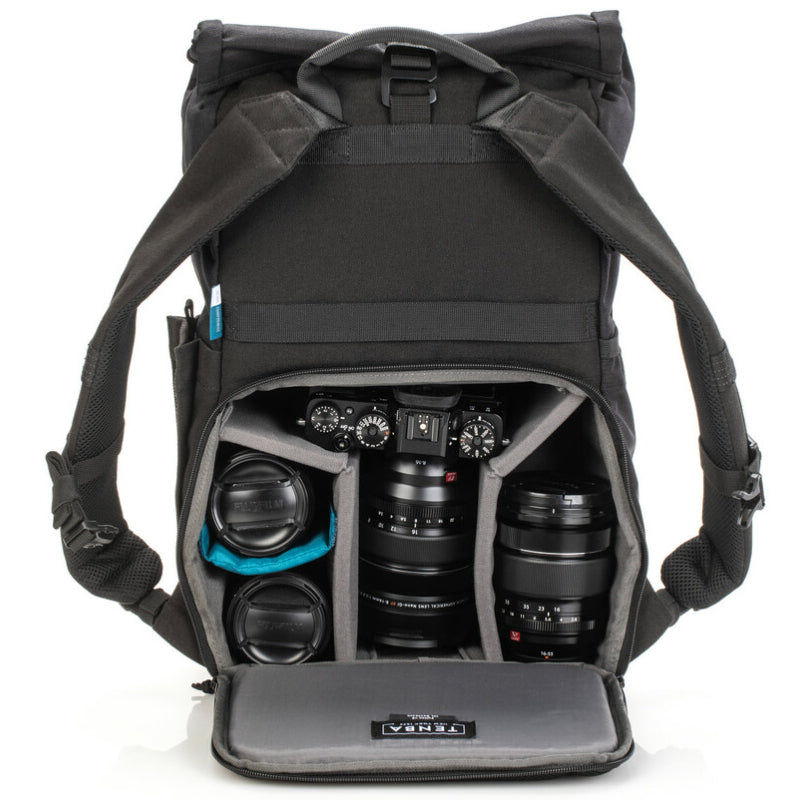 Fulton backpacks combine timeless, vintage style with modern comfort, function, and camera protection. Their soft, lightweight canvas design blends seamlessly into any environment, yet they possess a full complement of professional-grade features, such as secure rear camera access, tripod/monopod support, a padded laptop sleeve, and an expandable rolltop opening. The 14L backpack fits a mirrorless or DSLR camera with 3-4 lenses (up to attached 70-200mm 2.8), plus a laptop up to 14 inches (35 cm). It also fits the DJI Mavic and other compact drones. And the top rolltop section has tons of space for food, a lightweight jacket, and other personal gear.