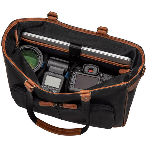 Stylishly store, transport, and protect up to two DSLR or mirrorless cameras, four to six lenses, a flash, and related accessories with the Sue Bryce Tote 15 in black with brown accents from Tenba. A padded interior sleeve accommodates an up to 15" laptop or tablet. The tote features interior and exterior pockets, padded touch-fastening interior dividers, dual top handles, and a removable shoulder strap.