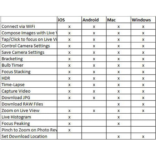 - Bracketing/HDR bulb mode, focus stacking