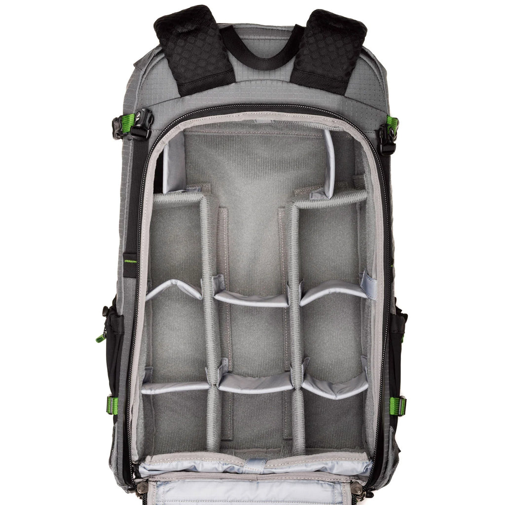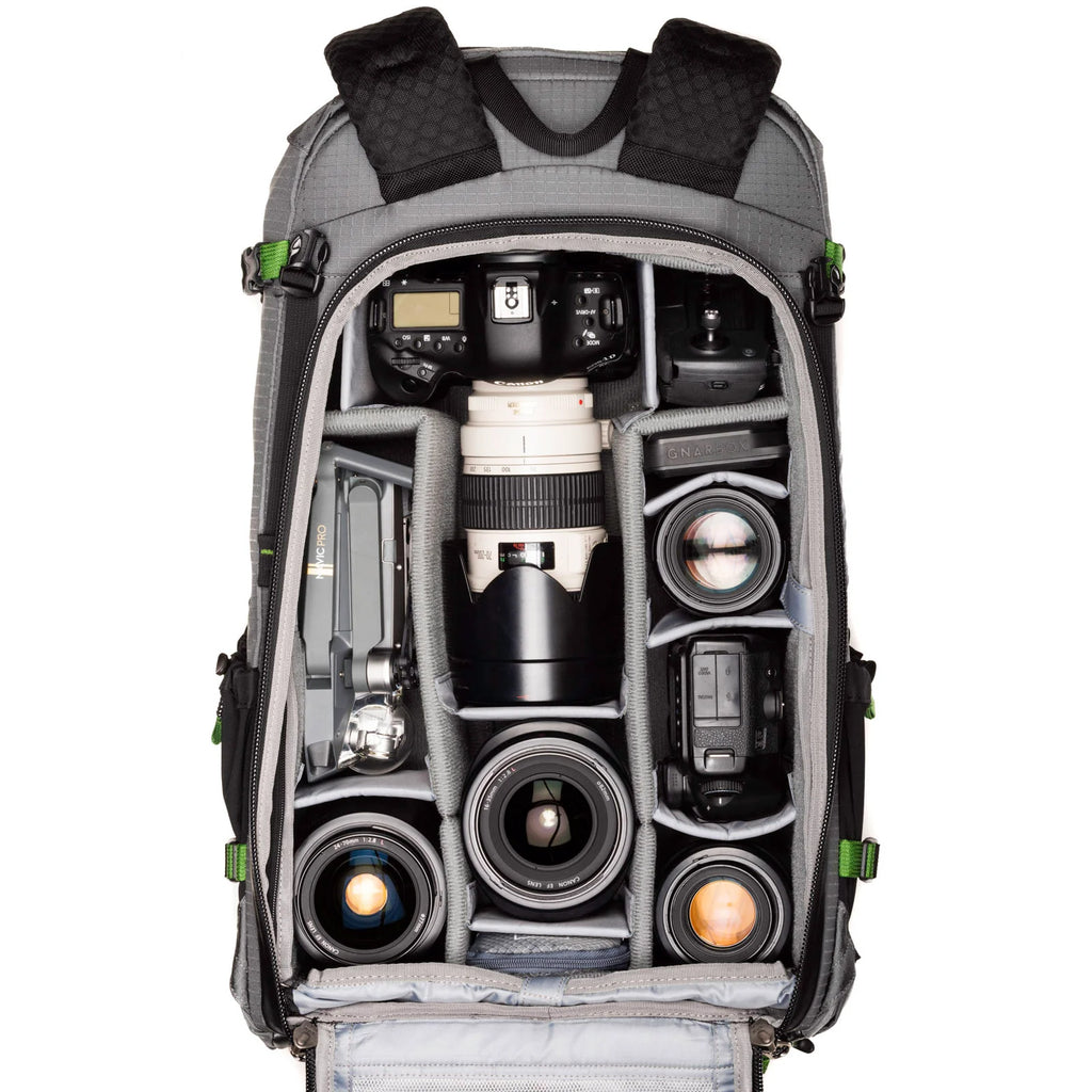 45 liters of available space provides ample room for both camera gear and adventure equipment, such as a length of rope, ice axe, snowboard/skis, laptop, tablet, and of course, a tripod.