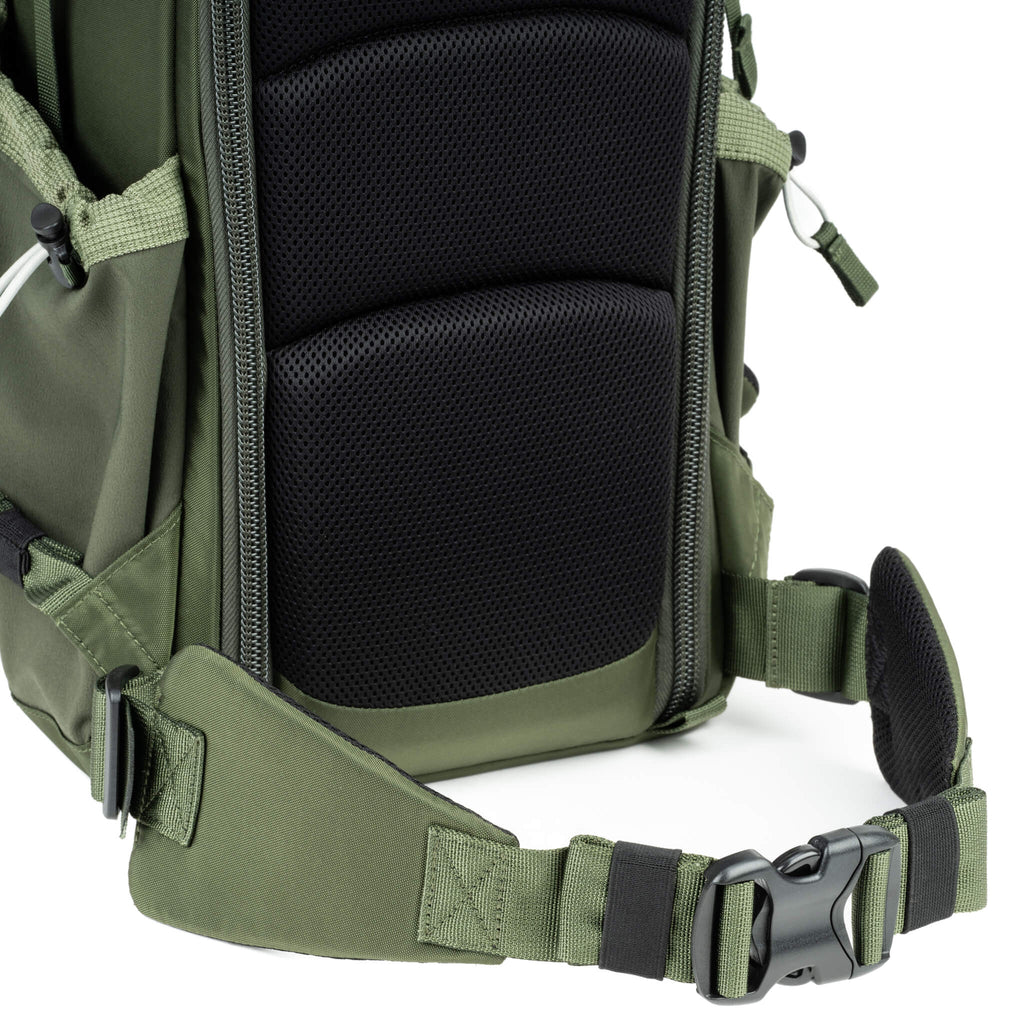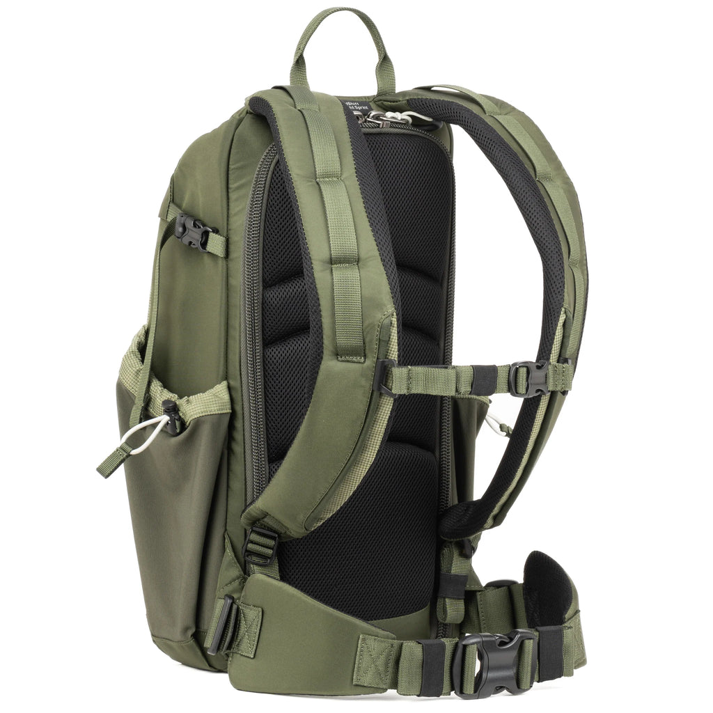 Despite its slim profile, the pack will hold a standard-sized camera body and the trifecta of zoom lenses. A minimal but plush harness systems provides comfortable, all-day carry and two large side pockets each fit a 32 oz Nalgene water bottle or can be used to carry a tripod.