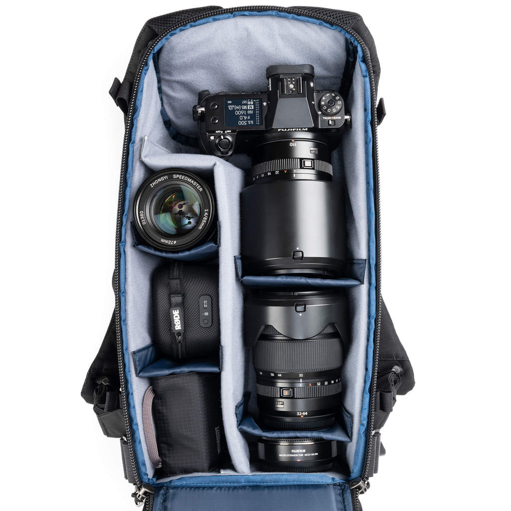 - Adjustable dividers accommodate large telephoto lenses, traditional photo gear, or personal items