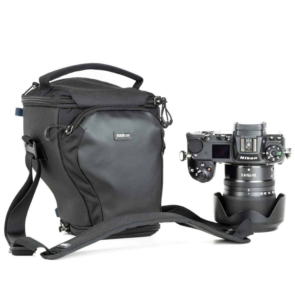 Unique holster developed specifically for a larger compact body with a 24-70mm f/4 attached with the hood reversed. Popped-down, it fits a 24-70mm f/2.8 with its lens hood reversed.