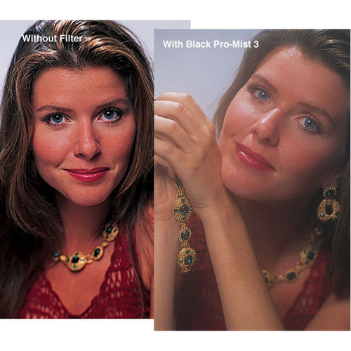 The 58mm Tiffen Black Pro-Mist 1/4 Filter helps to reduce the value of the highlights while slightly lowering the overall contrast. This filter is especially useful for smoothing out and softening facial wrinkles and other blemishes. While designed for use with movies, this filter can also be used for fashion and beauty applications. Unlike a traditional diffusion or soft focus filter, Pro-Mist filters provide little loss of detail across the image. The 1/4 density provides more contrast and highlight reduction than the 1/8, but less than the 1/2, while still allowing for a soft, pastel-like quality of light.