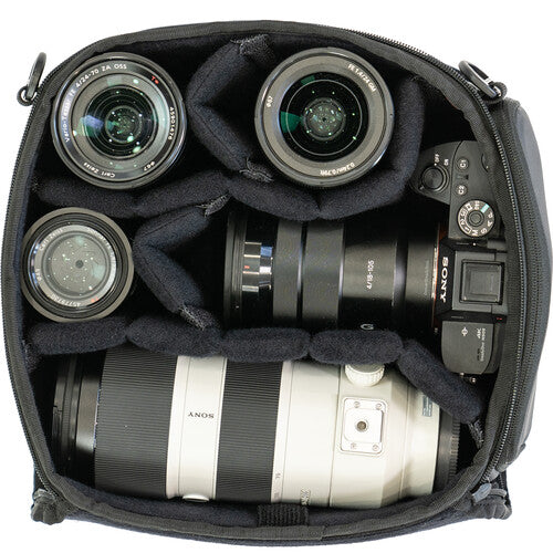 - Holds a DSLR or a mirrorless camera body with two to four lenses and accessories