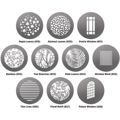 In The Box | Westcott Environmental Gobo Pack for Optical Spot by Lindsay Adler (10-Pack) Maple Leaves Gobo Abstract Leaves Gobo Prairie Window Gobo Bamboo Gobo Tree Branches Gobo Palm Leaves Gobo Window Blinds Gobo Thin Lines Gobo Floral Motif Gobo Palace Window Gobo Limited 90-Day Manufacturer Warranty |