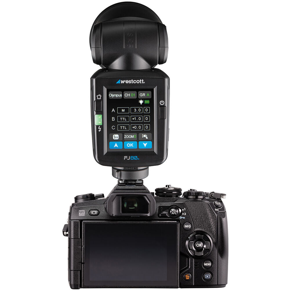 One of the FJ80's exciting features is its wide multi-brand TTL compatibility. The flash has an integrated 16-channel, 31-group, 2.4 GHz transceiver that can control multiple FJ200s, FJ400s, and FJ80s and is TTL compatible with Canon, Nikon, Sony (with adapter), FUJIFILM, Panasonic Lumix, and Olympus cameras when used on-camera as well as off-camera at distances up to 328' with separate purchase of a FJ-X2m Universal Wireless Trigger, an FJ80 Universal Speedlight with Built-In Transceiver, or another FJ80.
