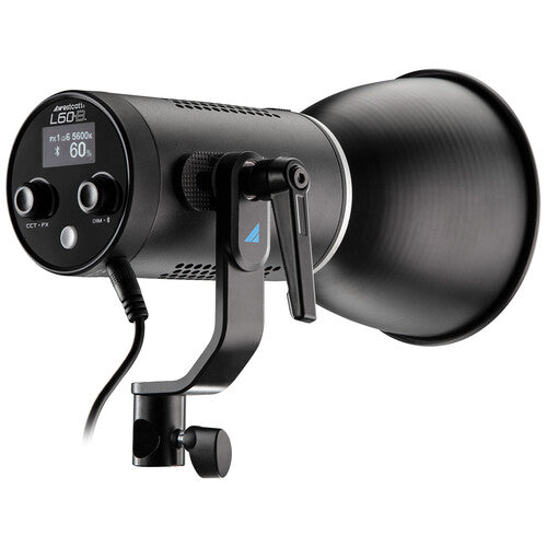 Among its many benefits are nine onboard special effects including lightning, fire, TV screen flicker, faulty light bulb, pulse, paparazzi flashes, headlights, SOS, and emergency lights. The L60-B runs on universal 100-240 VAC current, but it can also be powered by separately purchased D-tap or BP-F batteries when AC power is unavailable. Included with the L60-B COB LED are a removable yoke, an AC adapter, a 45° Ultra Reflector, a protective COB cover, a Rapid Box Switch insert (Westcott Mini), and a case.