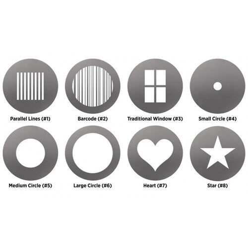 Filters | 8 x Gobos: Small Circle, Medium Circle, Large Circle, Heart, Star, Traditional Window, Parallel Lines, Barcode 5 x Gels: Red, Blue, Green, Orange, Yellow |