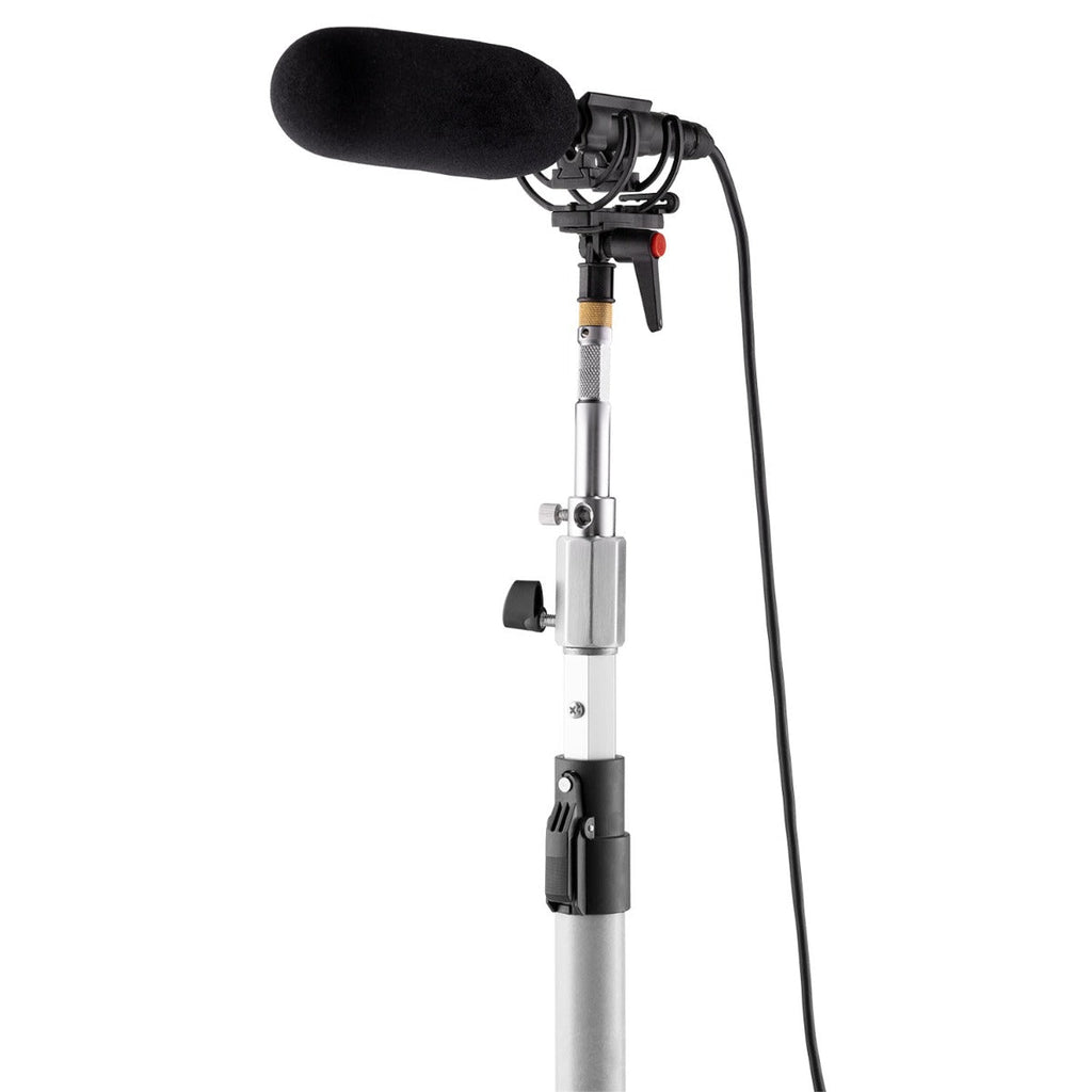 A simple yet useful solution to hold cameras, lights, modifiers, and microphones overhead, the Westcott Paint Pole Adapter is designed to extend the height of your equipment on the go. This silver, aluminum-constructed adapter quickly converts a painter's extension pole into a handheld boom. The adapter has a 5/8" baby pin with a 1/4"-20 female thread on top and standard 3/4"-5 extension pole threads on the bottom. This solid piece can hold a maximum load of 40 lb in the vertical orientation. In addition to its versatility, it also includes a built-in umbrella receptacle with a tension knob for securing umbrella-based light modifiers with shafts up to 9mm.A simple yet useful solution to hold cameras, lights, modifiers, and microphones overhead, the Westcott Paint Pole Adapter is designed to extend the height of your equipment on the go. This silver, aluminum-constructed adapter quickly converts a painter's extension pole into a handheld boom. The adapter has a 5/8" baby pin with a 1/4"-20 female thread on top and standard 3/4"-5 extension pole threads on the bottom. This solid piece can hold a maximum load of 40 lb in the vertical orientation. In addition to its versatility, it also includes a built-in umbrella receptacle with a tension knob for securing umbrella-based light modifiers with shafts up to 9mm.Benefits: