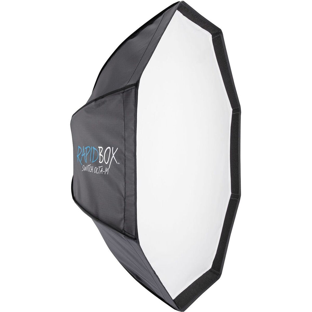 As the name "Switch" hints, Westcott has introduced a line of softboxes designed for setup and rapid swapping out of different brands of strobes and speedlights in seconds. The 36" Rapid Box Switch Octa-M Softbox is a good choice for use in the studio or on location for head and shoulders portraits, fashion, advertising, or corporate work. The large surface area of the softbox gives its output a wraparound quality especially when used close up. Another benefit is the reflection of natural-looking catchlights in your subject's eyes. As indicated in the name, the softbox has a basic ring to hold it together, but instead of full speed rings, 13 "inserts" are available for a speedlight or 12 different brands of strobes. The quick release thumb-lock on the Rapid Box Switch ensures the security of your light. Besides the benefit of speed, the softbox is structurally sound with durable metal framework, heat-resistant fabric, and a reflective silver interior that maximizes your light source's output. The Rapid Box Switch Octa's diffusion material has also been thoroughly tested and found to be neutral, ensuring a true rendition of color. A carry case is included for storage and transport.