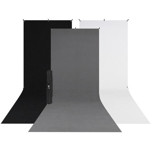 Photograph people and objects with this 5 x 12' X-Drop 3-Pack Sweep Backdrop Kit from Westcott. The kit includes wrinkle-resistant white, black, and gray backdrops, a carrying case, and a stand.