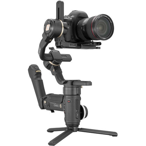 The CRANE 3S Handheld Stabilizer from Zhiyun-Techis a powerful redesign of previous Zhiyun gimbals with the addition of detachable handle options, more powerful motors with a large 14.3 lb payload, an updated axis-locking system, external power input, and the ViaTouch 2.0 remote control system. The 55° angled roll axis allows you to fit your camera without blocking the view, and it is also modular so you can add an included extension arm to fit larger cameras.